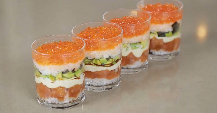 Суши шот (лосось в соусе спайсе , тобико и нори)