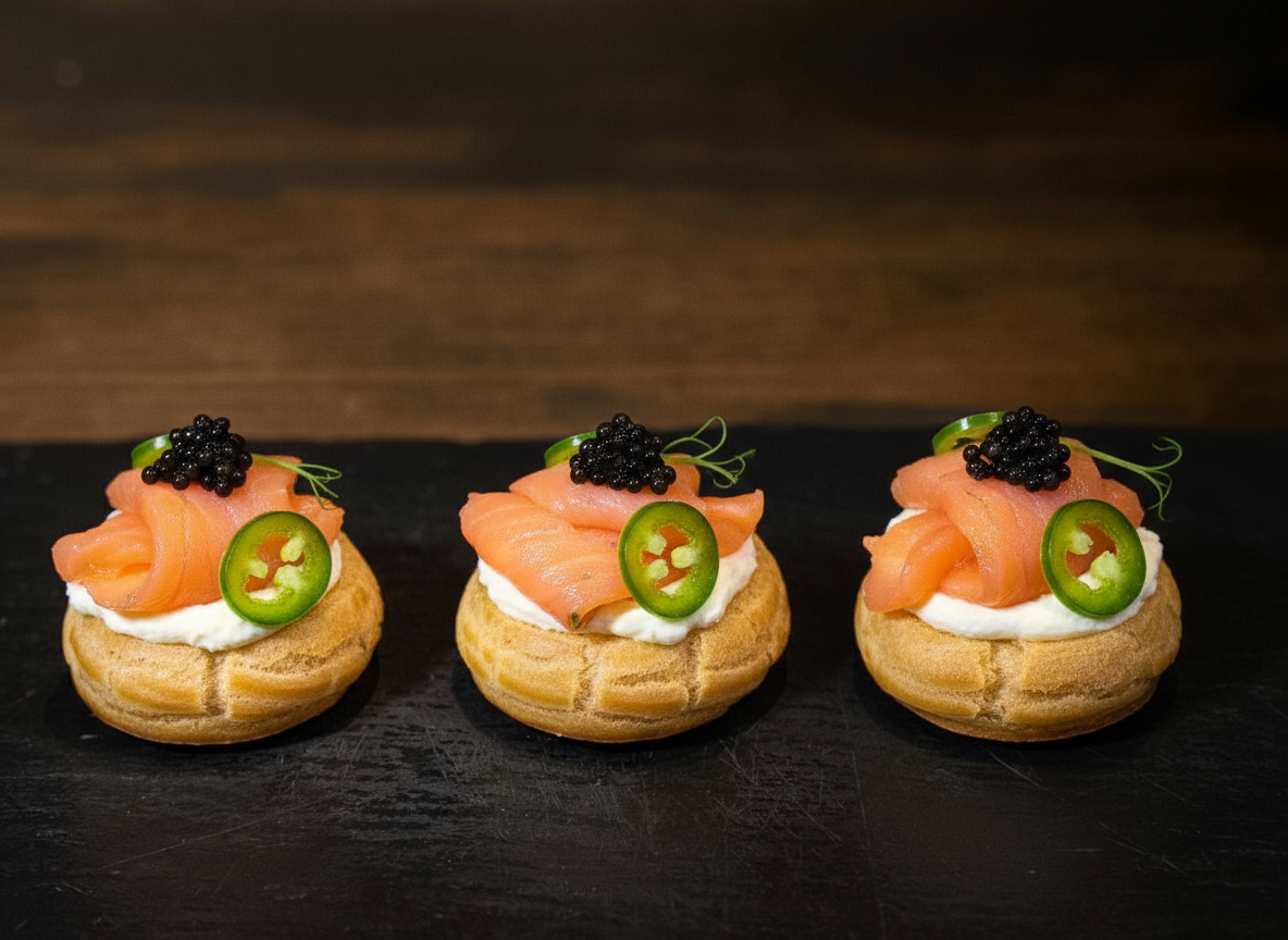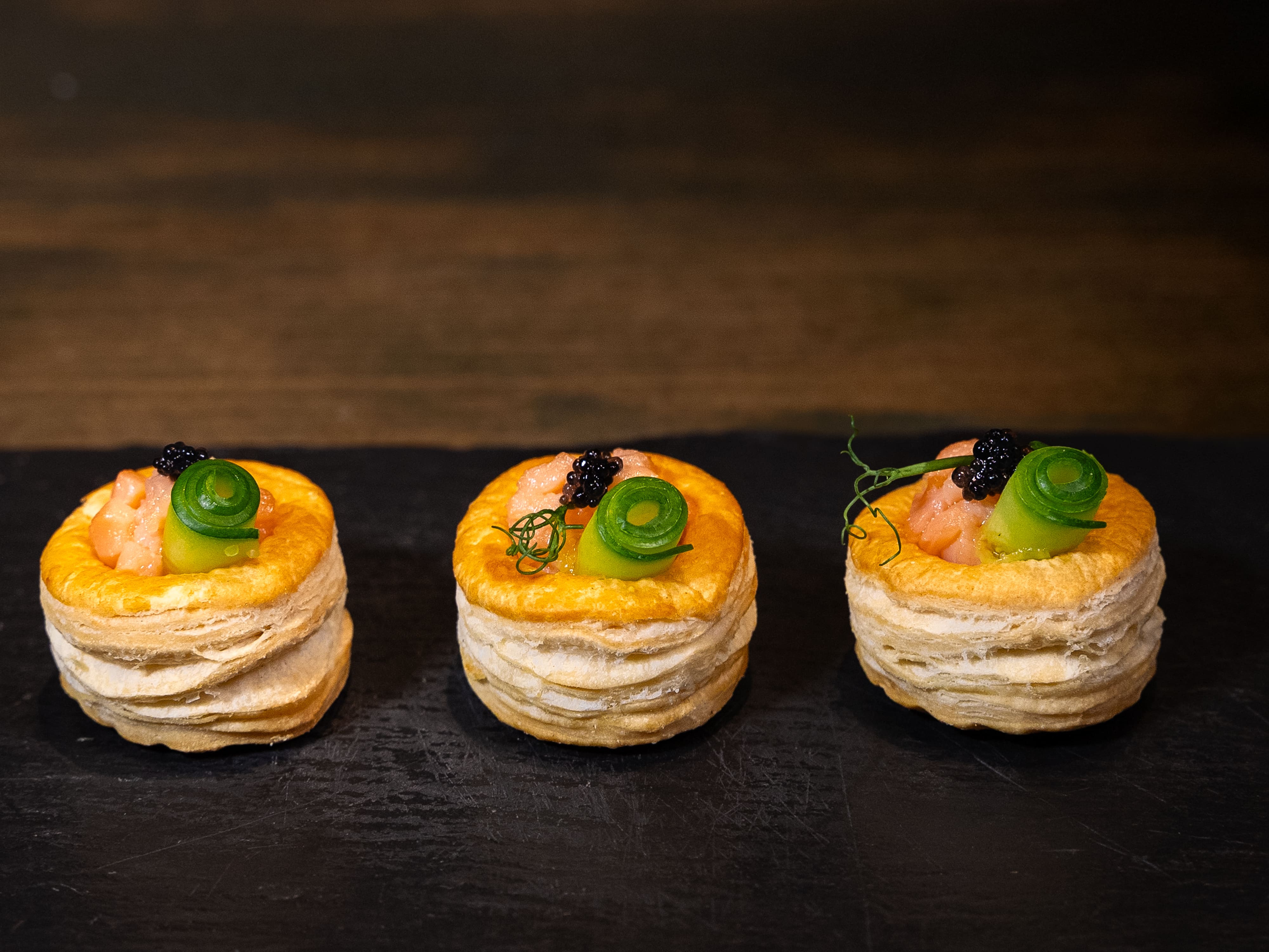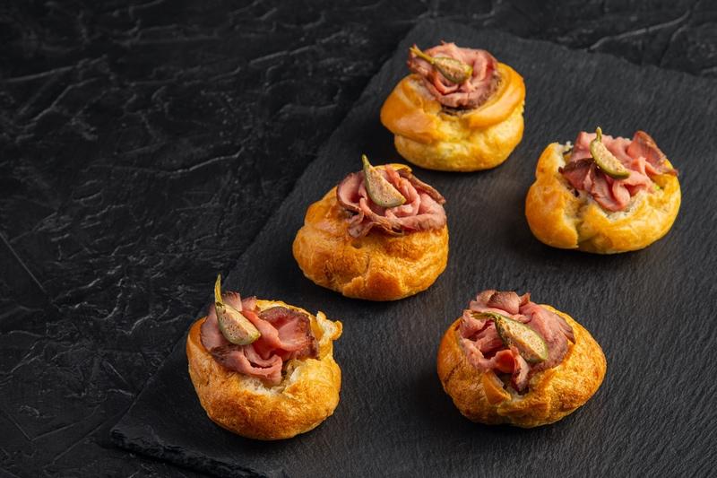 Каждая тарталетка и профитроль готовится из премиальных ингредиентов. Гармоничное сочетание вкусов и текстур на одной закуске.